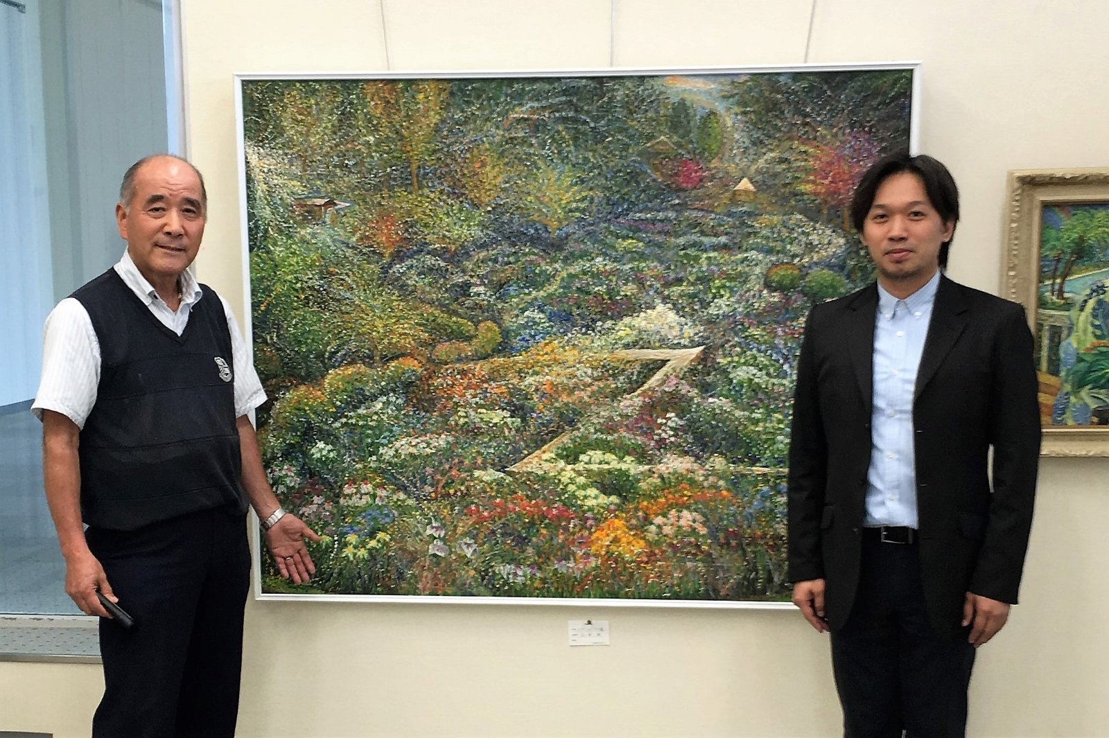 【台日交流展】日本第23回《NAU21世紀美術連立展》-東京國立新美術館展覽-ichonokigallery社長、藝術家 加藤和美女士與台灣參展者 王穆提先生(日本NAU21世紀美術連立展成員)於台灣參展者 王穆提先生作品前合影。