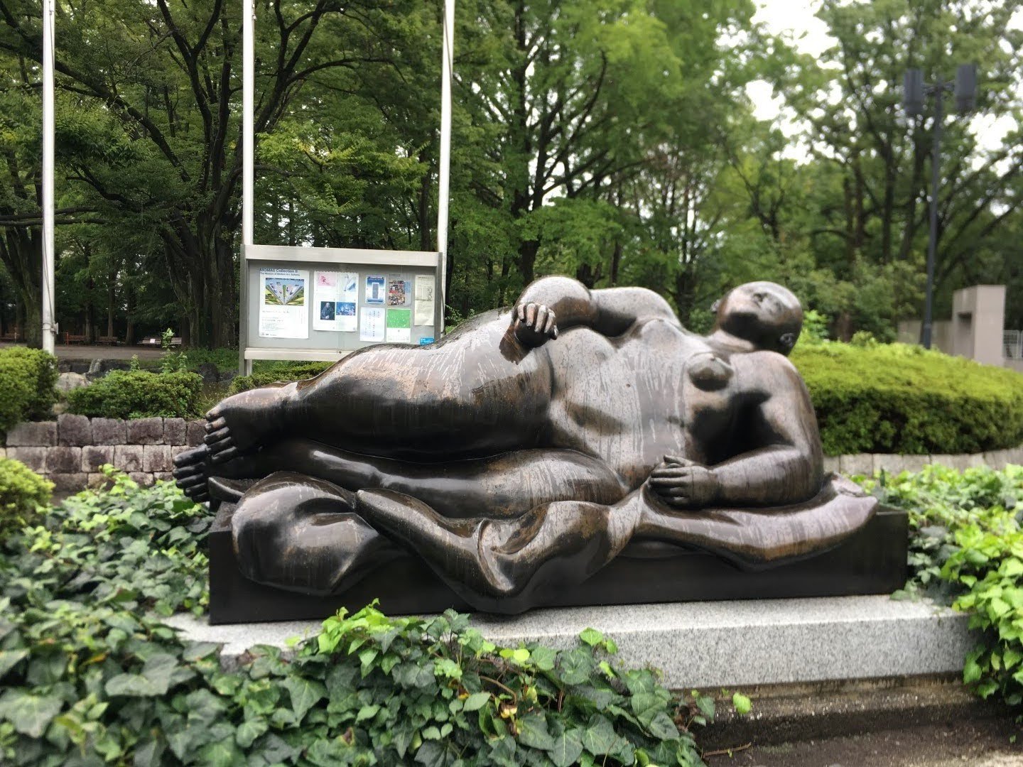 這尊體態豐腴、充滿詼諧感的青銅雕塑,橫臥在綠色的草坪上,與黑川紀章幾何剛硬的建築形成有趣的對比,展現了拉丁美洲藝術的生命力。