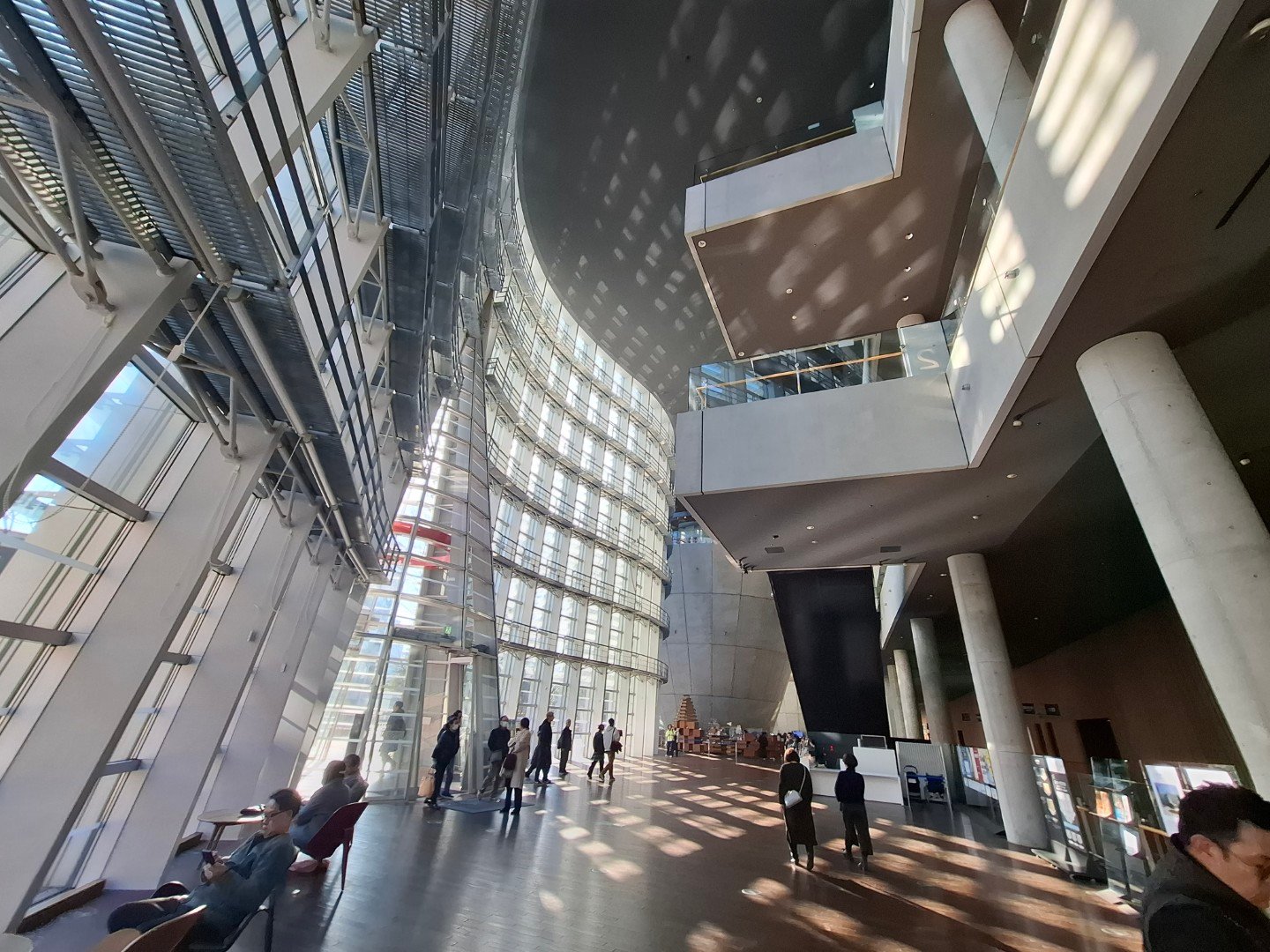 - NACT 的玻璃帷幕會引入自然光。在白天,陽光灑落在 〈聖境・阿里山〉 上,水墨的層次會變得極其豐富,彷彿看見了森林深處的苔蘚。