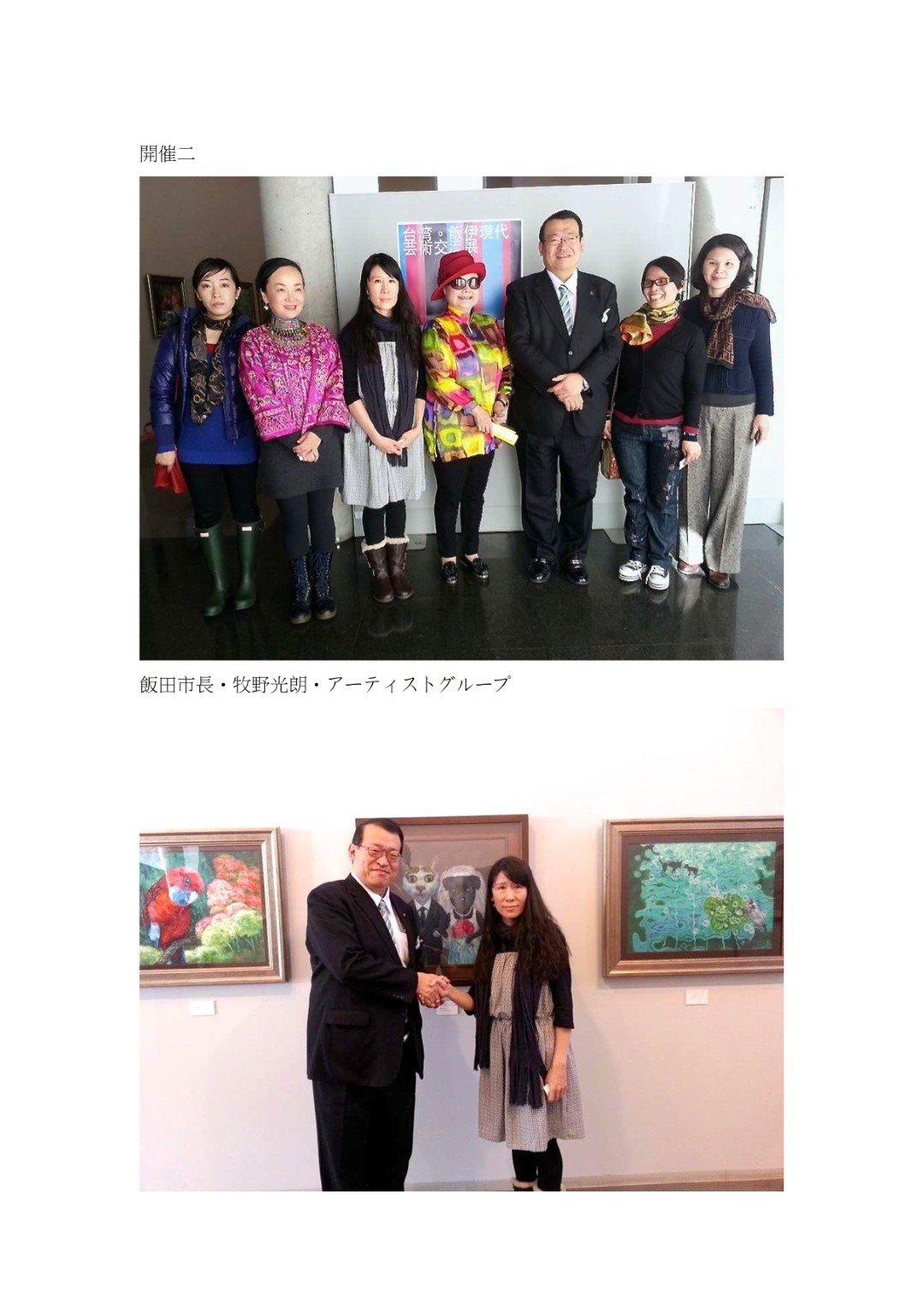 2014年2月,「臺灣・飯田下伊那現代藝術文化交流展」將於長野縣飯田市美術博物館正式舉辦。本展旨在透過藝術創作,深化臺灣與日本之間的文化理解與友好關係。來自臺灣的藝術作品將在此展中亮相,期待藉由多元視覺語彙,向日本觀眾傳遞臺灣當代藝術的豐富面貌。